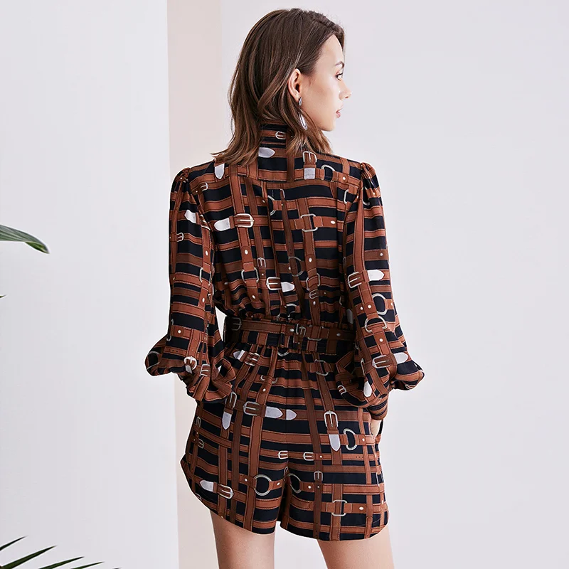 Images of POKWAI women silk blouses and shorts sets 2 pieces casual fashion set office lady wear :