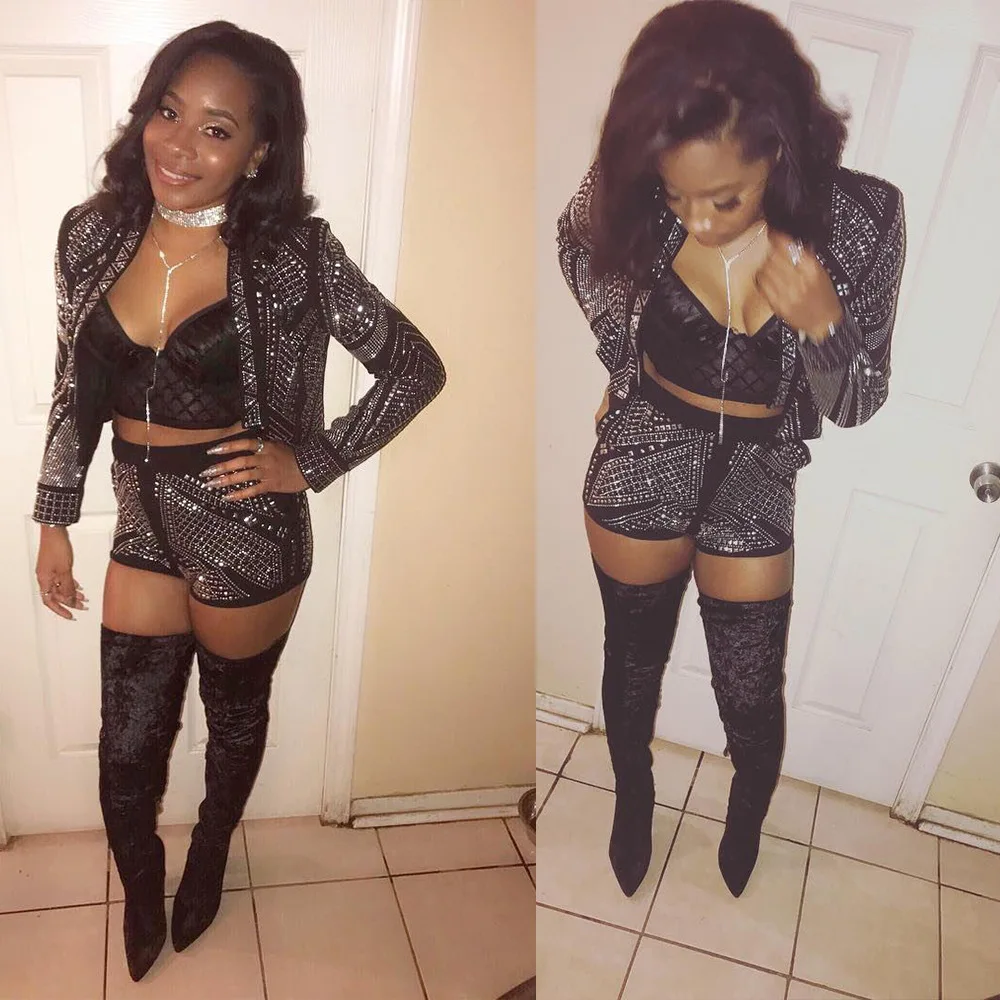 Images of Women Glitter Diamond Long Sleeve Crop Top and Shorts 2 Piece Set 2020 Trendy Women Luxury Sexy Party Outfits :