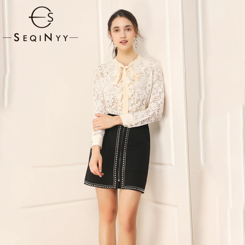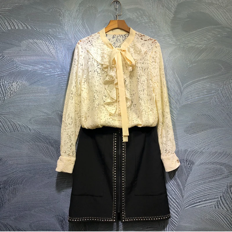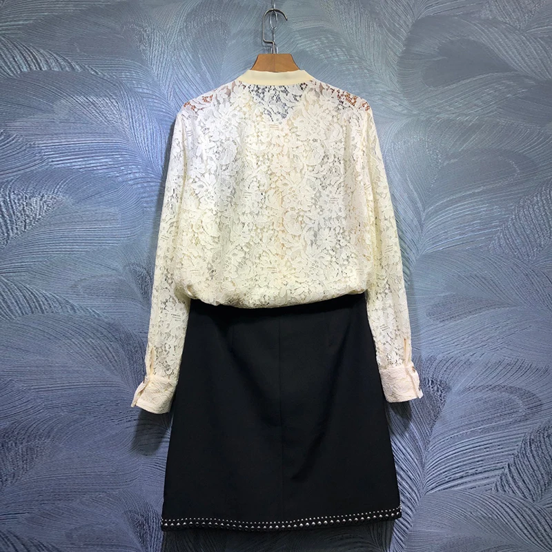 Images of SEQINYY Office Lady Set 2020 Summer Spring New Fashion Design Women Long Sleeve Beige Lace Shirt + Mini Rivet Black Skirt Suit :